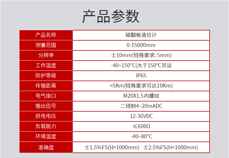 MIK-UZ-B磁翻板液位计根据浮力原理,浮子在测量筒内随液位的升降而上下移动,浮子内的永久磁钢通过磁耦合作用,驱动红白翻柱翻转 180°,液位上升时,翻柱由白色转为红色,下降时由红色转为白色,从而实现液位的指示。 在液位计的主体上安装变送器,可以实现远传显示,变送器由传感器和转换器两部分组成,传感器通过磁浮子上下移动,经磁耦合作用使导管内干簧管(或磁传感器)依次动作,获得电阻信号变化,转换成(4~20)mA 的标准电流信号输出。在液位计主体上安装报警开关,可实现报警或联锁控制。适用于低温到高温、真空到高压等各种环境,是石油化工等行业理想的液位测量产品。